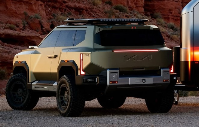 साइड प्रोफाइल में मोटी क्लैडिंग, बड़े ब्लैक अलॉय व्हील्स और हाई ग्राउंड क्लीयरेंस हैं, जो कठिन इलाकों में चलने की क्षमता का संकेत देते हैं। रियर में भी LED लाइटिंग का यूनिक पैटर्न और स्पोर्टी बंपर है। कुल मिलाकर, Titan Walker का लुक Ford Bronco या Land Rover Defender जैसी हार्डकोर ऑफ-रोड SUV की याद दिलाता है, लेकिन Kia ने इसमें अपना यूनिक futuristic टच जोड़ा है।